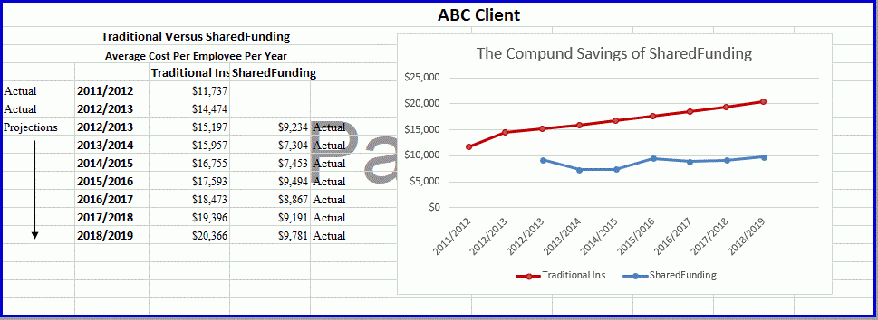 While we are pretty good, we are not magical. Unfortunately, you’ll notice their healthcare costs did rise through the years with SharedFunding. However, the true value of SharedFunding is that your increases are on a smaller premium amount; hence, the compound savings of SharedFunding.
